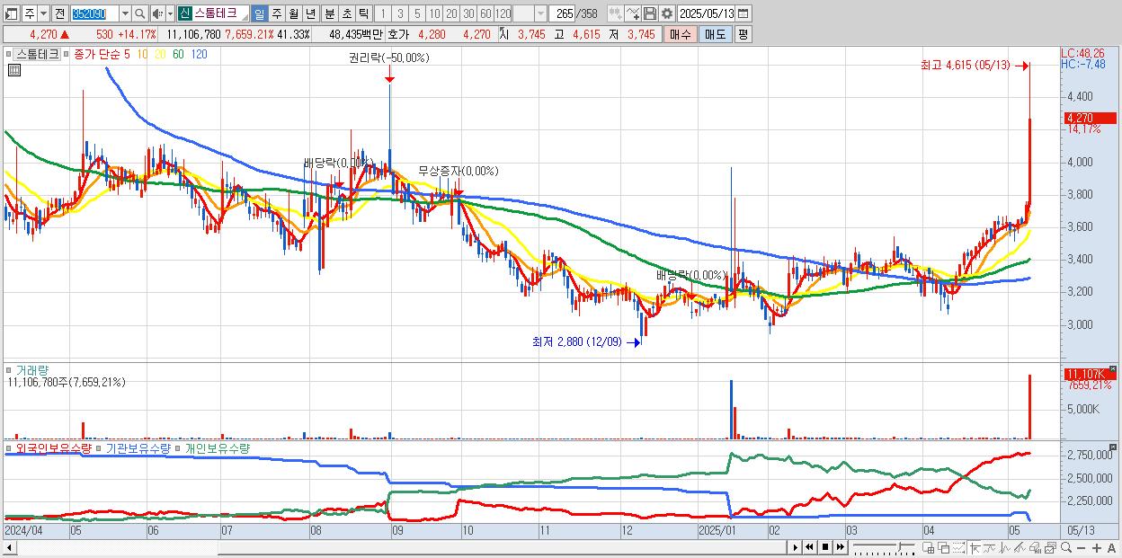 - 스톰테크 (4,270원 ▲ 14.17% , 시총: 1,147억, 거래량: 11,106,780, 거래대금:484억)