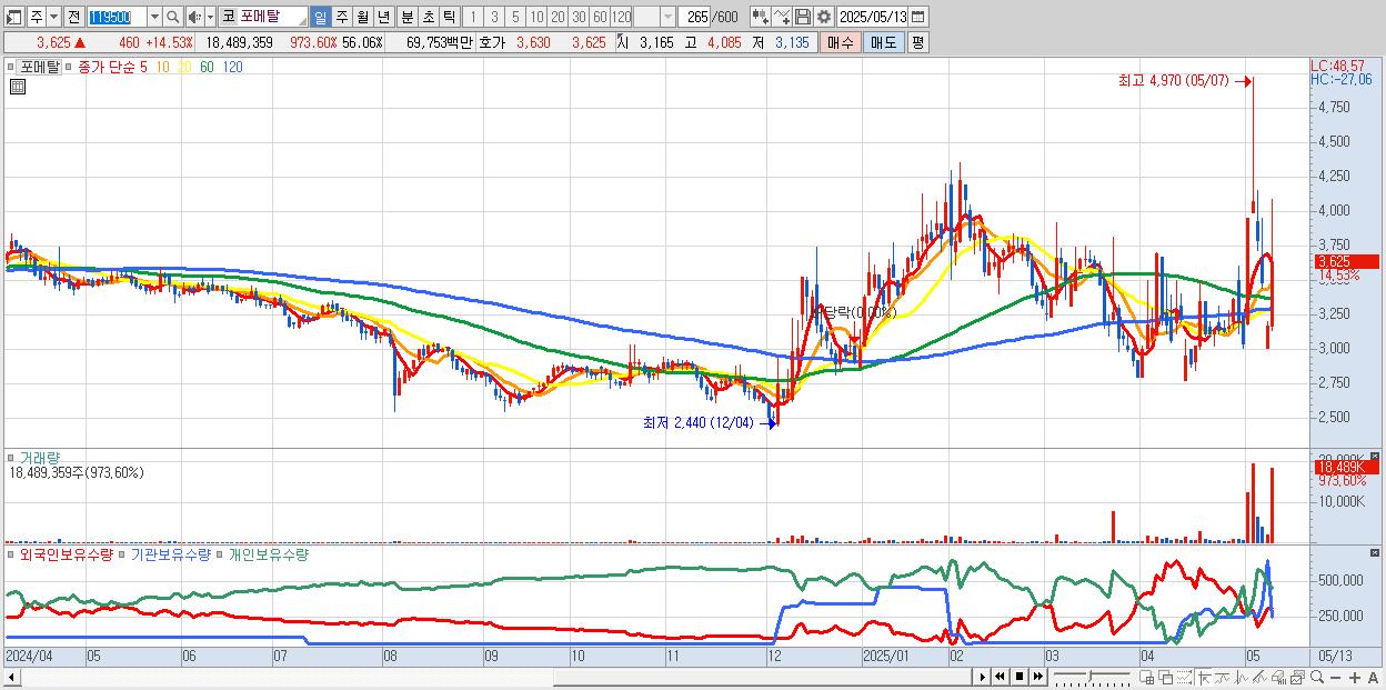- 포메탈 (3,625원 ▲ 14.53% , 시총: 429억, 거래량: 18,489,359, 거래대금:698억)