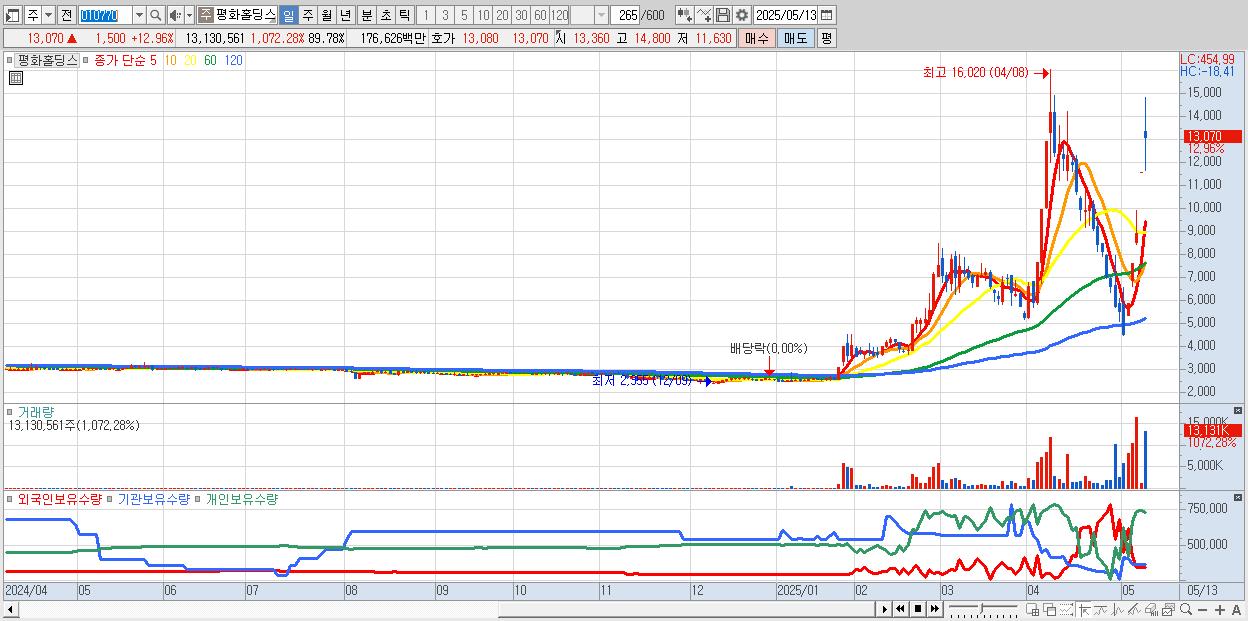 - 평화홀딩스 (13,070원 ▲ 12.96% , 시총: 1,912억, 거래량: 13,130,561, 거래대금:1,766억)