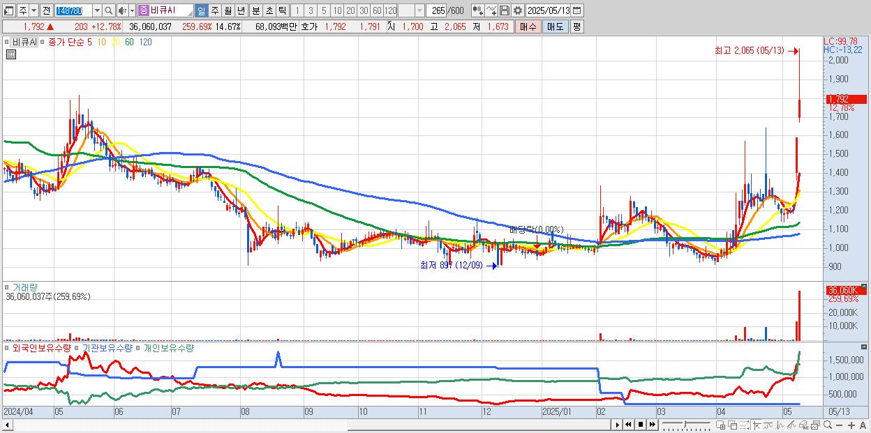 - 비큐AI (1,792원 ▲ 12.78% , 시총: 564억, 거래량: 36,060,037, 거래대금:681억)