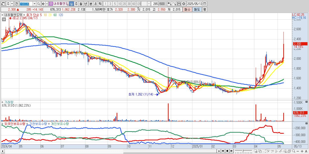 - 내츄럴엔도텍 (2,300원 ▲ 14.14% , 시총: 730억, 거래량: 676,313, 거래대금:16억)