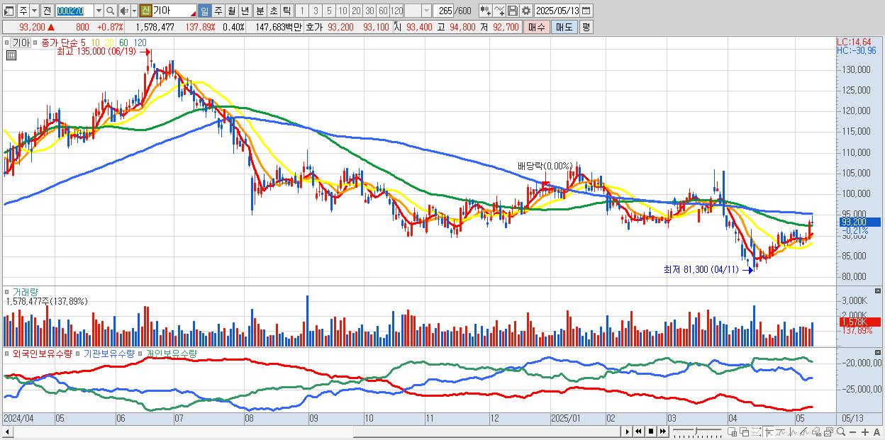 - 기아 (93,700원 ▲ 1.41% , 시총: 372,619억, 외국인 순매수 거래금:151억)