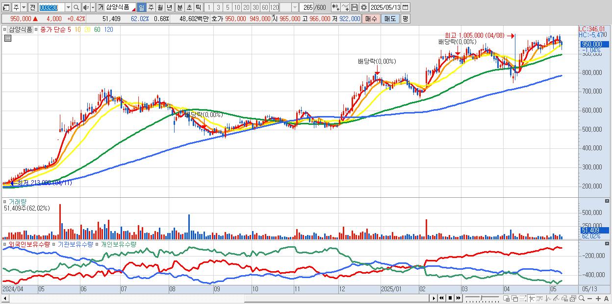 - 삼양식품 (950,000원 ▲ 0.42% , 시총: 71,564억, 외국인 순매수 거래금:83억)