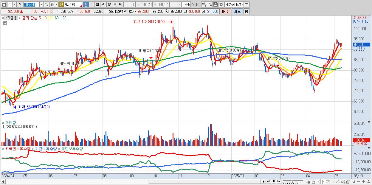 - KB금융 (92,600원 ▲ 0.43% , 시총: 364,407억, 외국인 순매수 거래금:80억)
