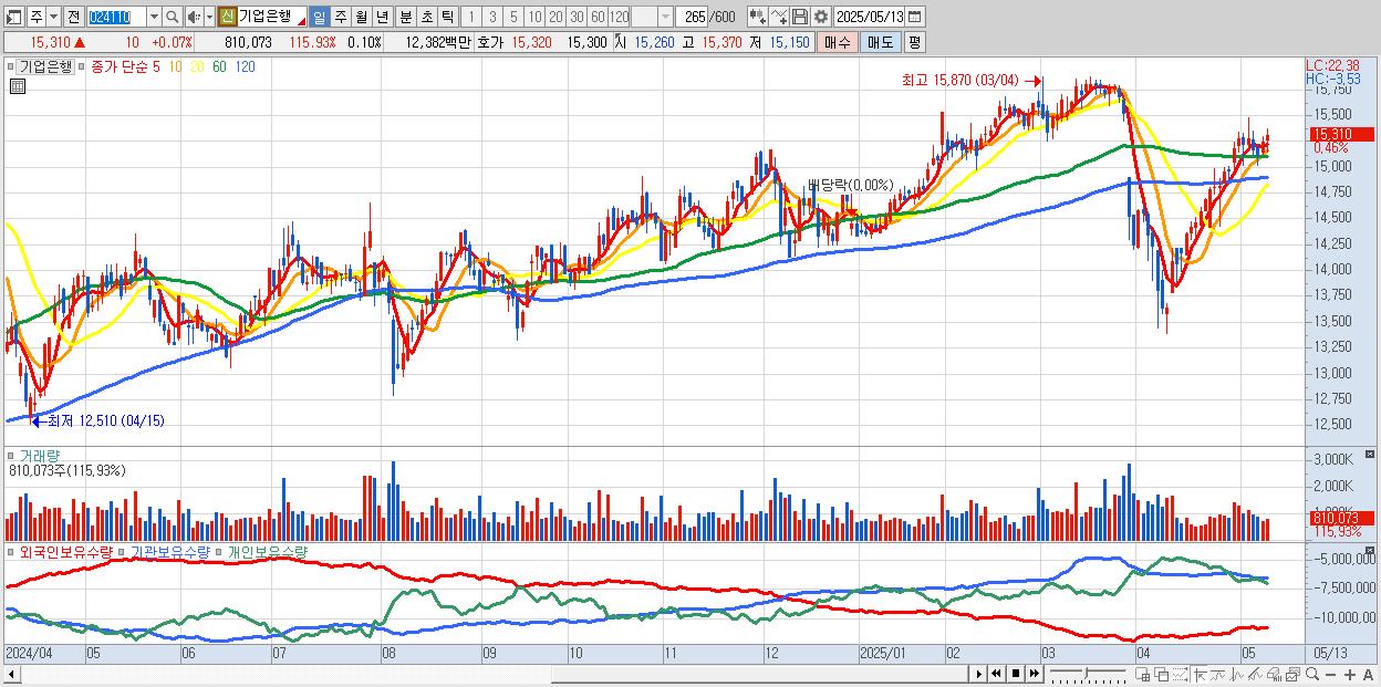 - 기업은행 (15,360원 ▲ 0.39% , 시총: 122,485억, 외국인 순매수 거래금:48억)