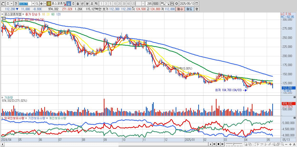 - 포스코퓨처엠 (120,100원 ▼ -2.52% , 시총: 93,033억, 외국인 순매수 거래금:111억)