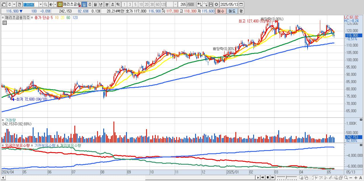 - 메리츠금융지주 (116,900원 ▼ -0.09% , 시총: 210,437억, 외국인 순매수 거래금:49억)