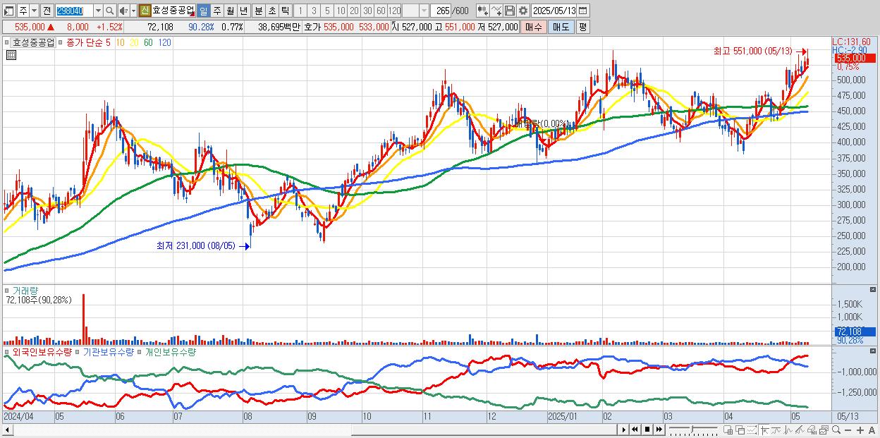 - 효성중공업 (540,000원 ▲ 2.47% , 시총: 50,353억, 외국인 순매수 거래금:70억)