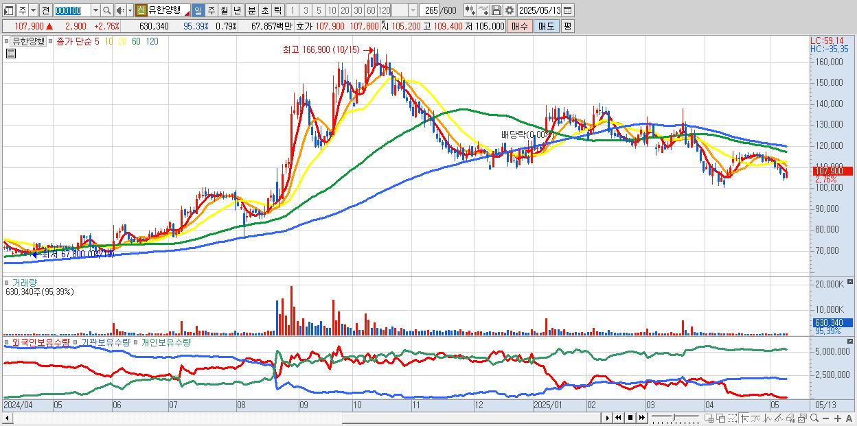 - 유한양행 (107,800원 ▲ 2.67% , 시총: 86,465억, 외국인 순매수 거래금:131억)