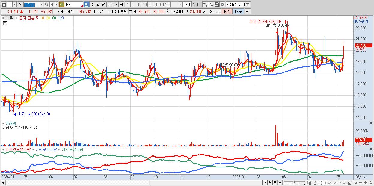 - HMM (20,400원 ▲ 5.81% , 시총: 209,108억, 외국인 순매수 거래금:154억)