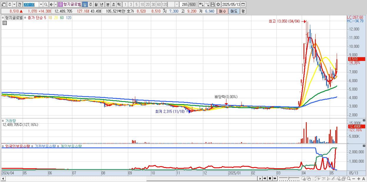 - 형지글로벌 (8,510원 ▲ 14.38% , 시총: 741억, 거래량: 12,489,705, 거래대금:1,055억)