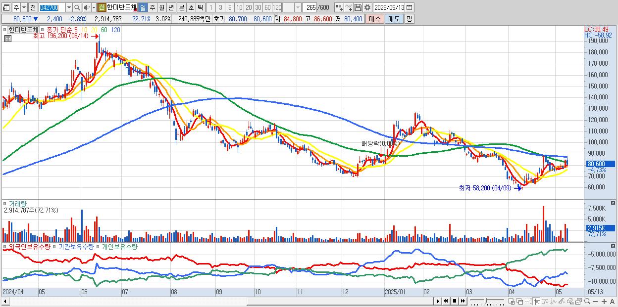 - 한미반도체 (81,000원 ▼ -2.41% , 시총: 78,258억, 거래량: 1,429,499, 거래대금:1,173억)