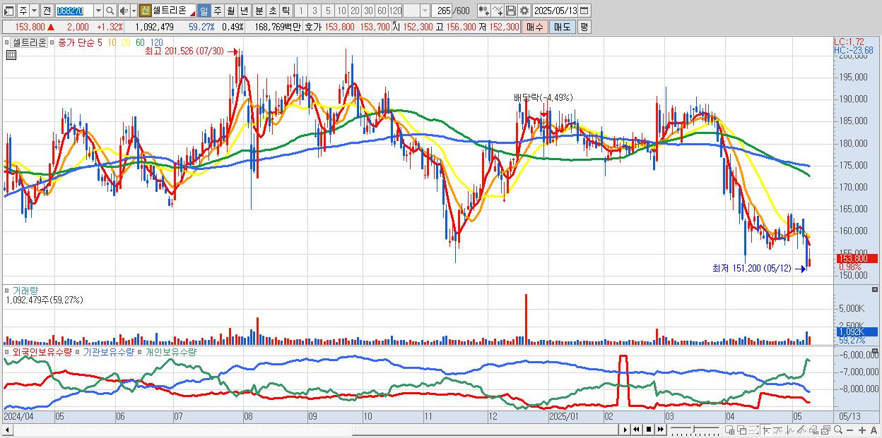 - 셀트리온 (154,300원 ▲ 1.65% , 시총: 344,073억, 거래량: 788,857, 거래대금:1,219억)