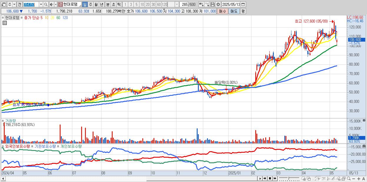 - 현대로템 (106,600원 ▼ -1.57% , 시총: 116,346억, 거래량: 1,798,218, 거래대금:1,883억)