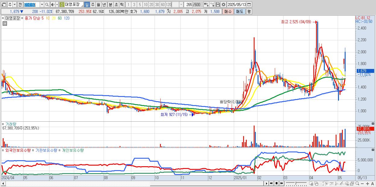 - 대영포장 (1,679원 ▼ -11.02% , 시총: 1,820억, 거래량: 67,380,709, 거래대금:1,261억)