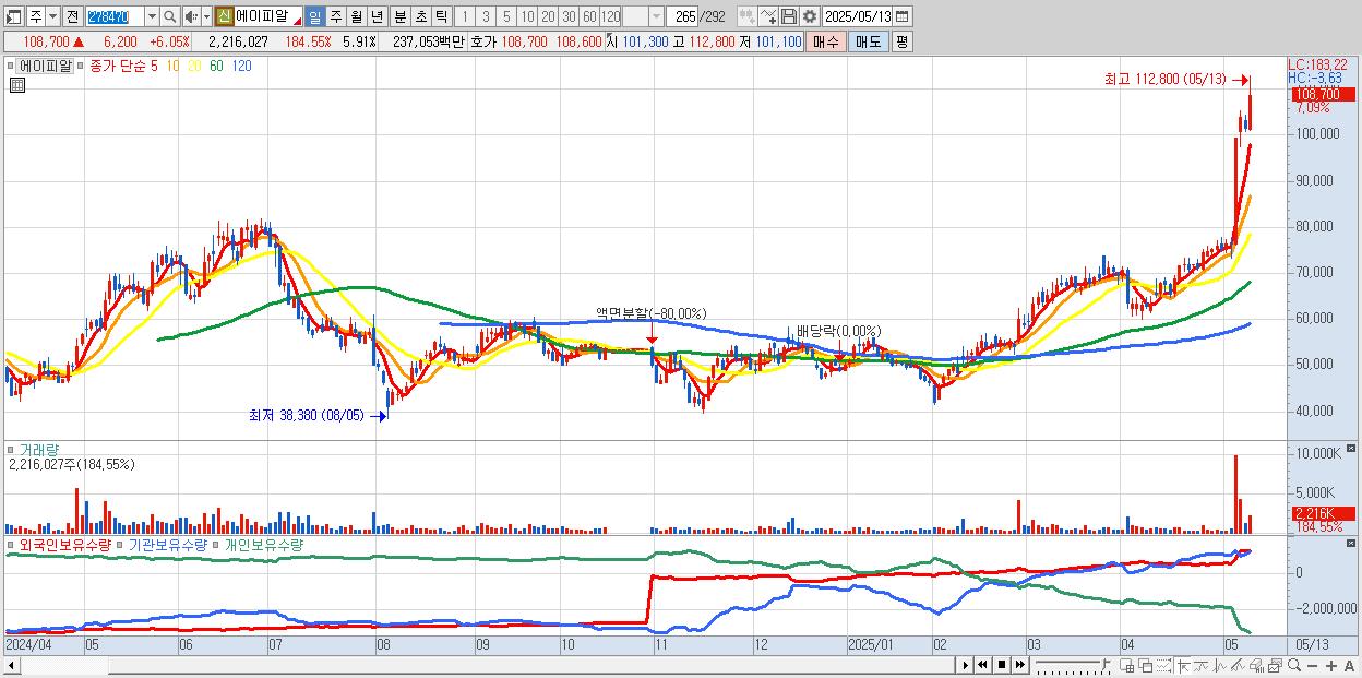 - 에이피알 (109,100원 ▲ 6.44% , 시총: 40,892억, 거래량: 1,184,780, 거래대금:1,261억)