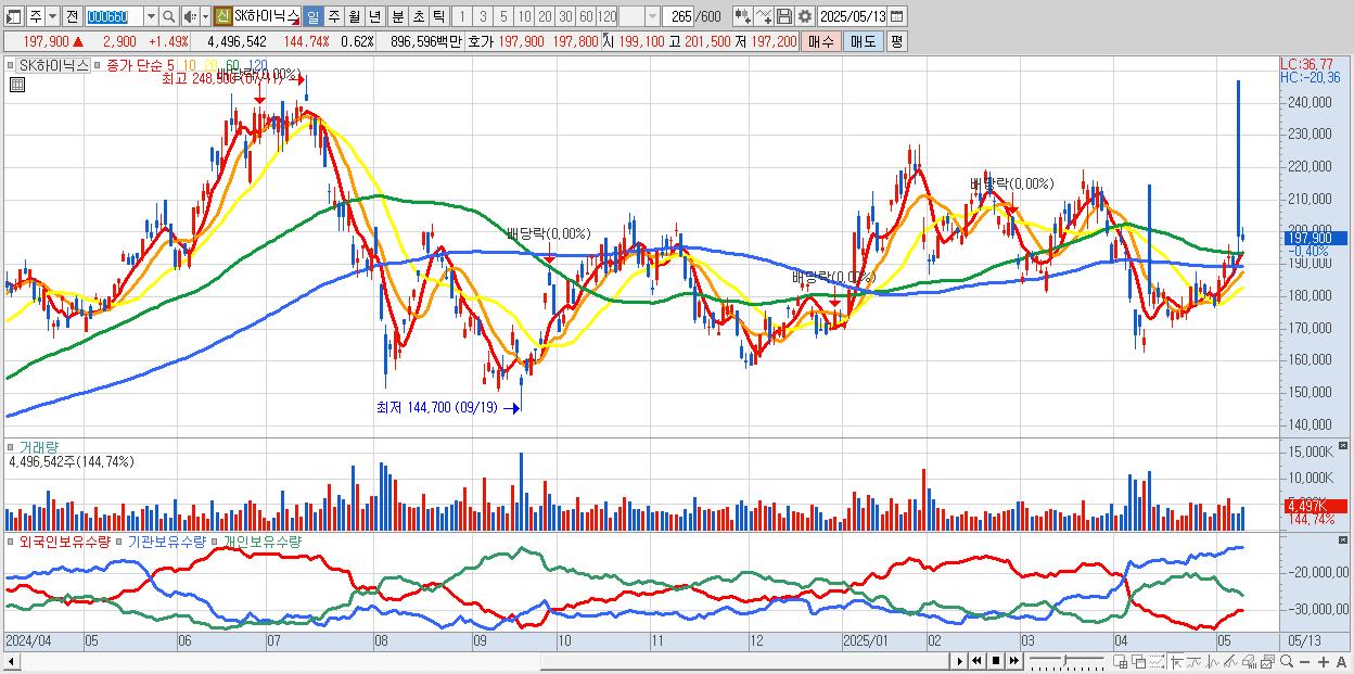 - SK하이닉스 (198,500원 ▲ 1.79% , 시총: 1,445,085억, 거래량: 3,385,009, 거래대금:6,749억)