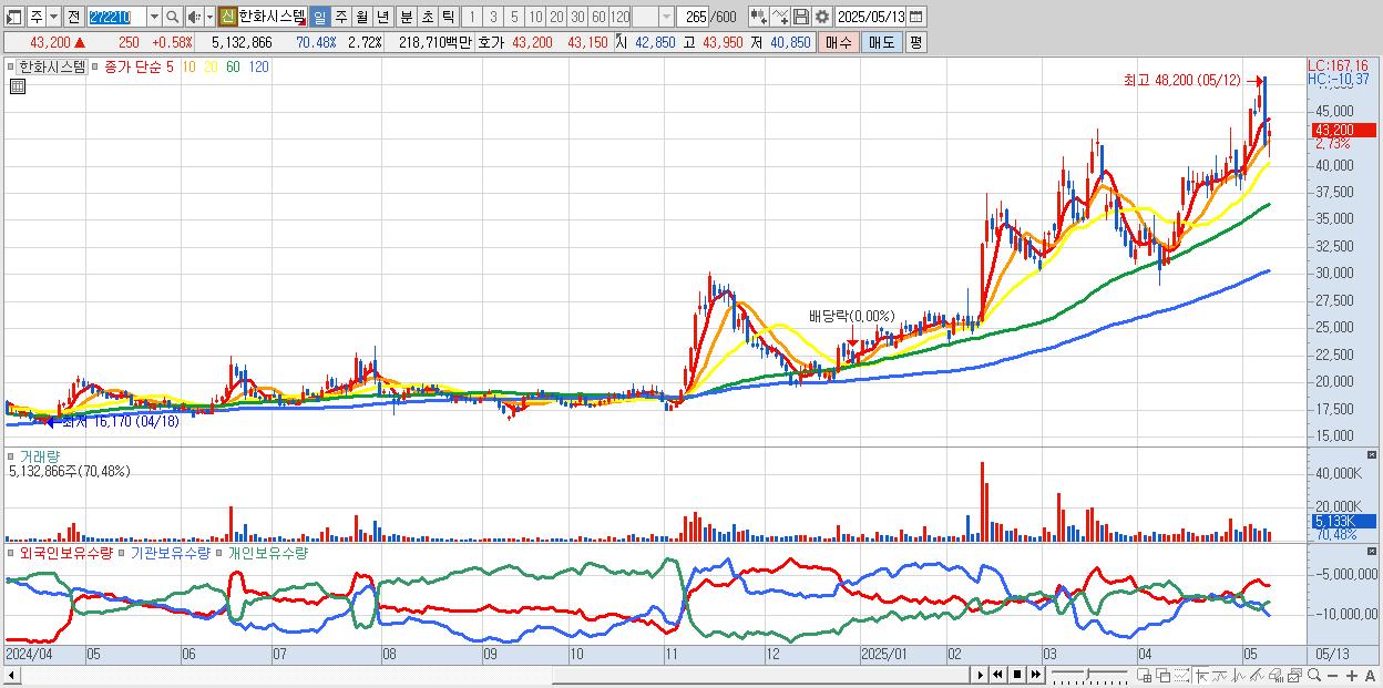 - 한화시스템 (43,200원 ▲ 0.58% , 시총: 81,613억, 거래량: 2,917,294, 거래대금:1,246억)