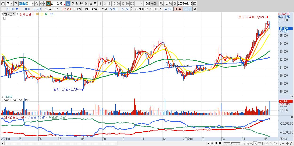 - 한국전력 (25,750원 ▼ -4.28% , 시총: 165,306억, 거래량: 5,507,277, 거래대금:1,409억)