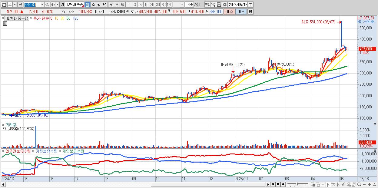 - HD현대중공업 (409,500원 ▲ 1.24% , 시총: 363,526억, 거래량: 273,519, 거래대금:1,100억)