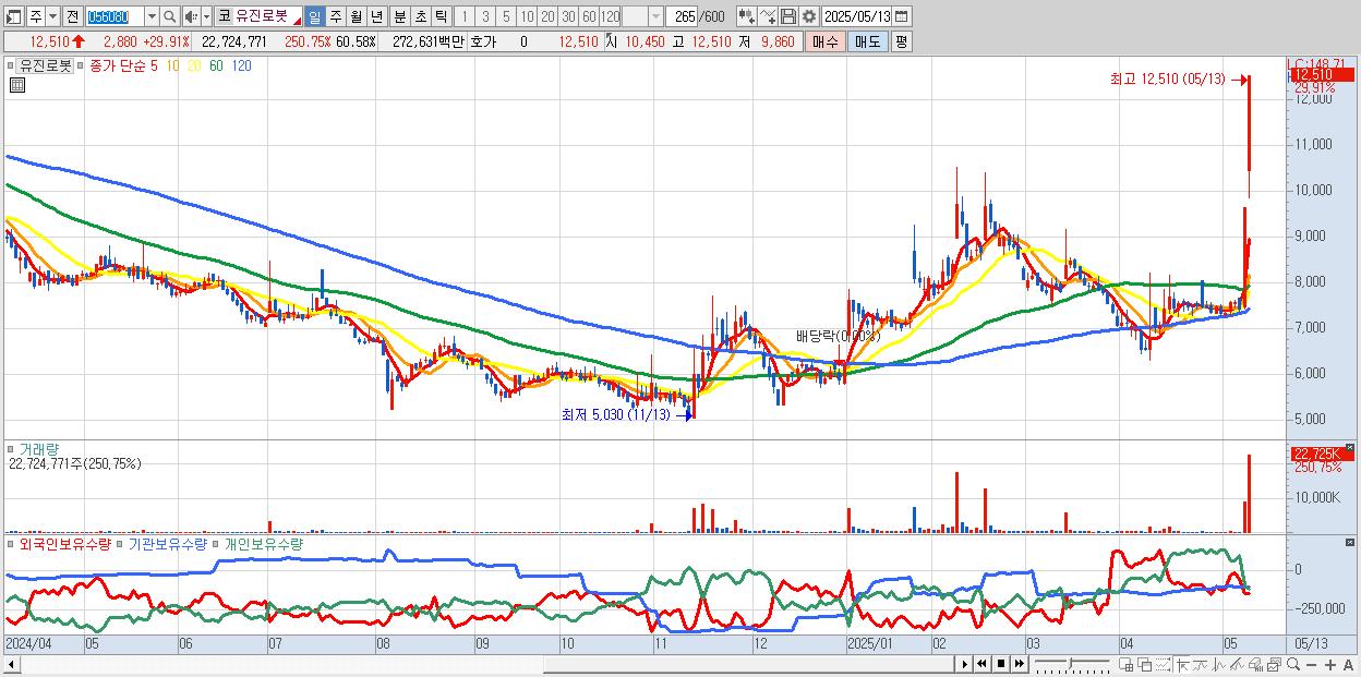 - 유진로봇 (12,510원 ▲ 29.91% , 시총: 4,693억, 거래량: 9,093,176, 거래대금:1,114억)