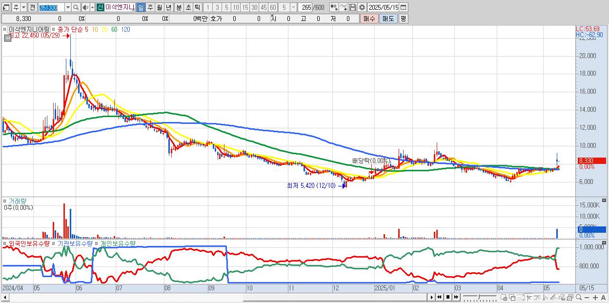 - 이삭엔지니어링 (8,330원 ▲ 12.87% , 시총: 690억, 거래량: 4,382,985, 거래대금:383억)