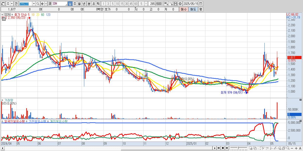 - SDN (1,617원 ▲ 18.98% , 시총: 1,031억, 거래량: 90,172,126, 거래대금:1,439억)