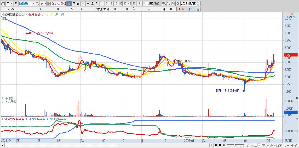 - 오하임앤컴퍼니 (2,750원 ▲ 12.02% , 시총: 586억, 거래량: 471,618, 거래대금:13억)
