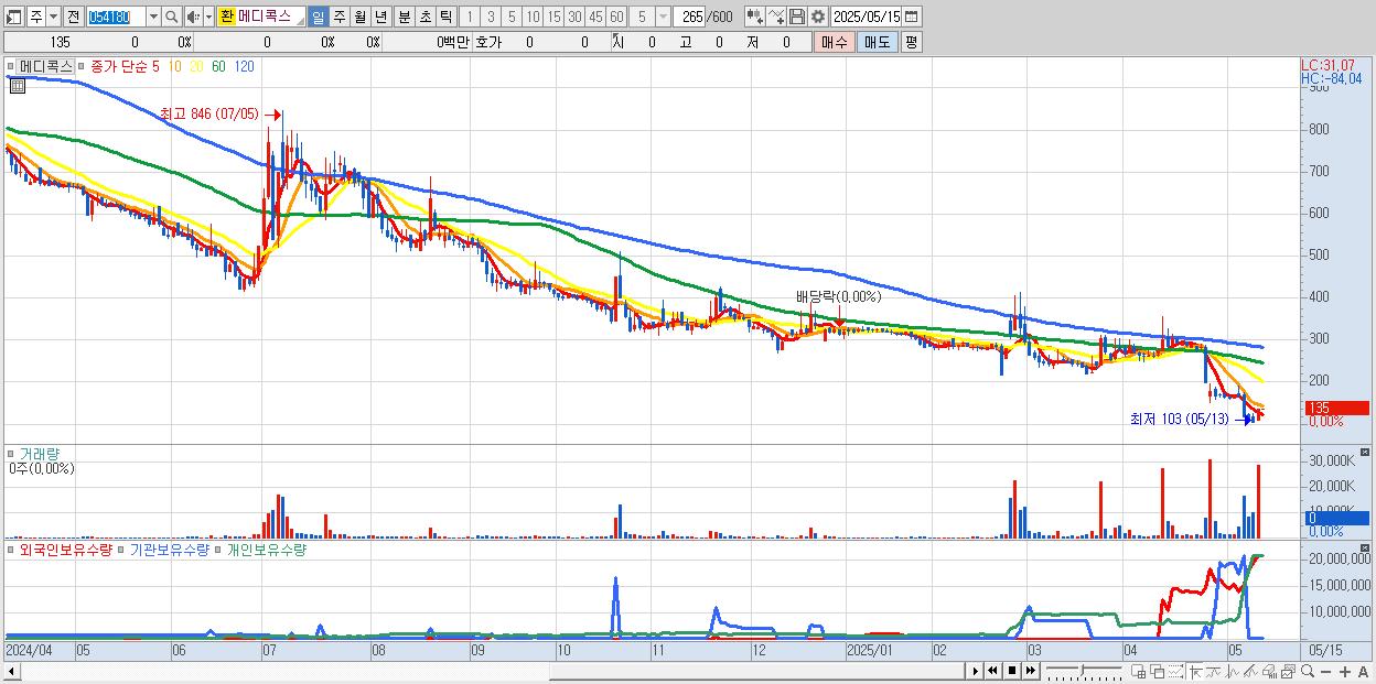 - 메디콕스 (135원 ▲ 29.81% , 시총: 112억, 거래량: 28,587,014, 거래대금:38억)