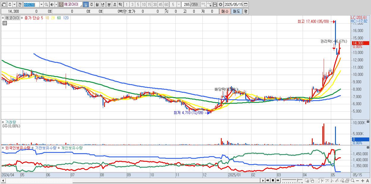 - 에코아이 (14,300원 ▲ 11.63% , 시총: 1,412억, 거래량: 276,404, 거래대금:39억)