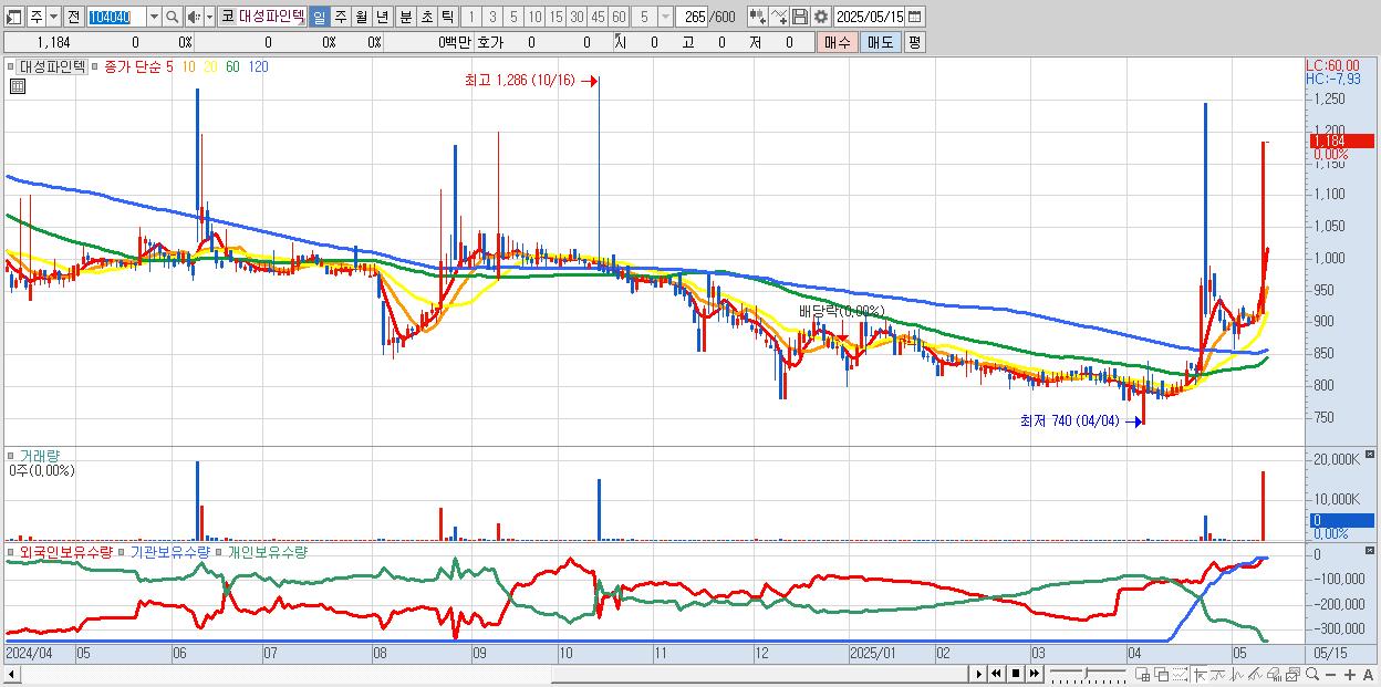 - 대성파인텍 (1,184원 ▲ 29.97% , 시총: 559억, 거래량: 17,277,604, 거래대금:192억)