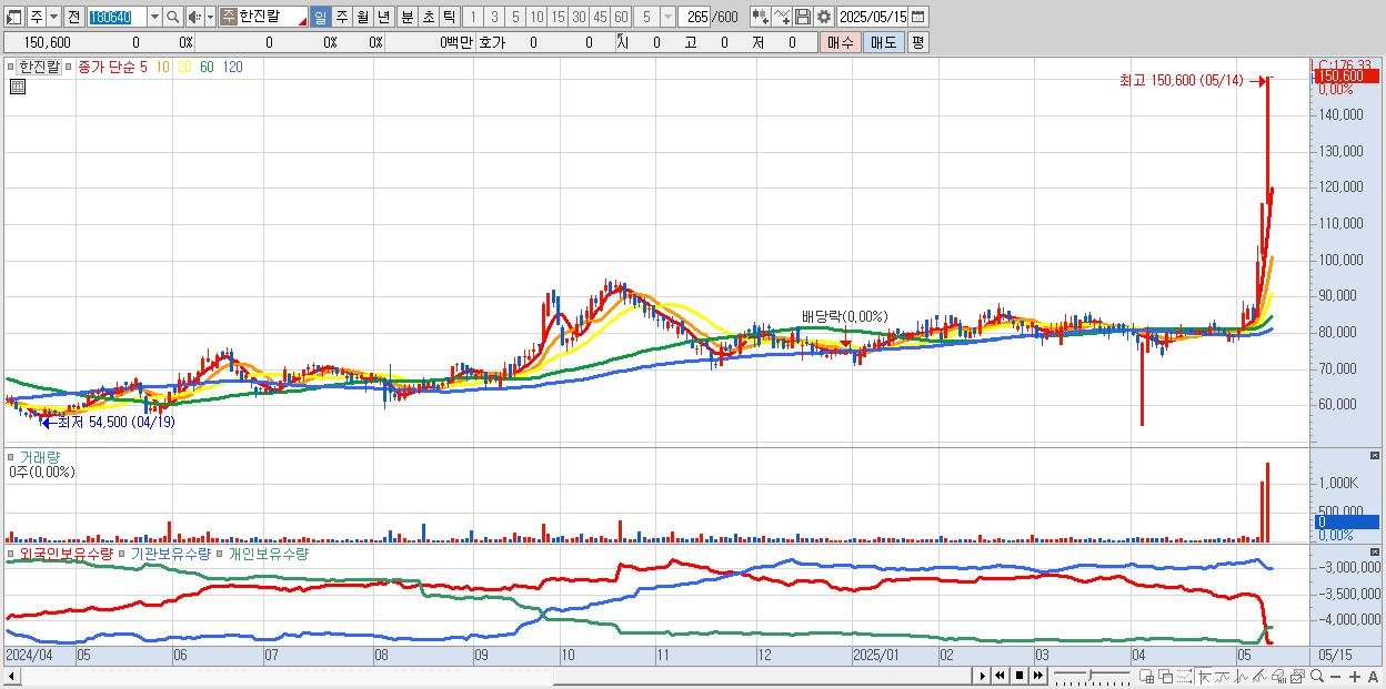 - 한진칼 (150,600원 ▲ 29.94% , 시총: 100,544억, 거래량: 846,472, 거래대금:1,255억)