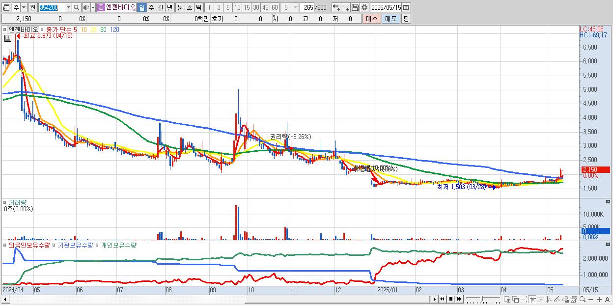 - 엔젠바이오 (2,150원 ▲ 13.16% , 시총: 426억, 거래량: 1,692,891, 거래대금:35억)