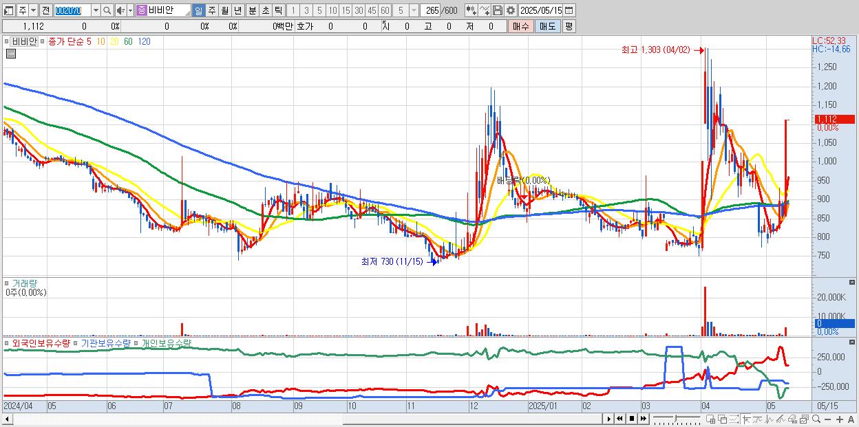 - 비비안 (1,112원 ▲ 29.91% , 시총: 346억, 거래량: 4,231,191, 거래대금:44억)