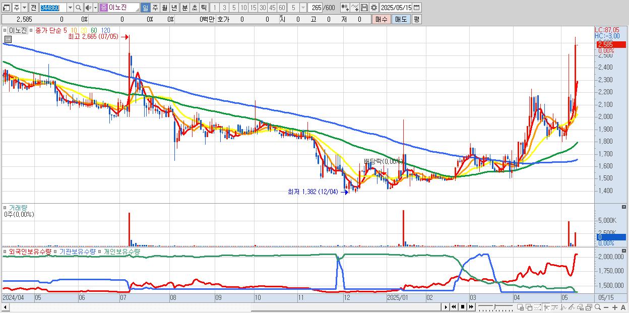 - 이노진 (2,585원 ▲ 25.18% , 시총: 311억, 거래량: 2,681,337, 거래대금:65억)