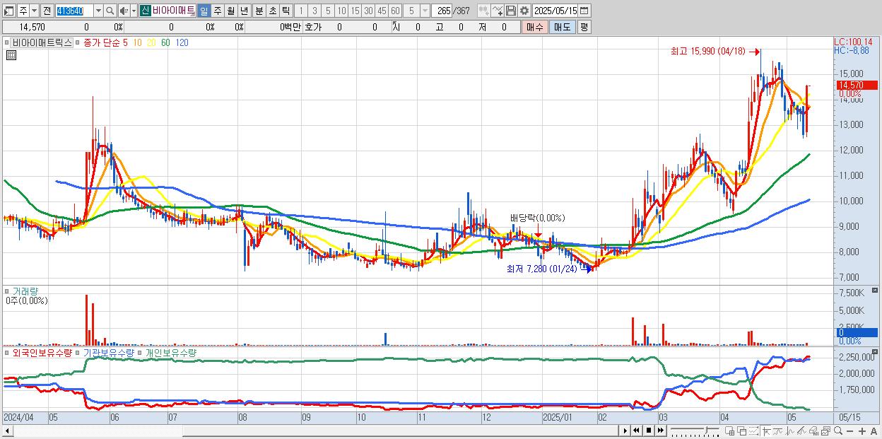 - 비아이매트릭스 (14,570원 ▲ 15.27% , 시총: 1,050억, 거래량: 286,885, 거래대금:40억)