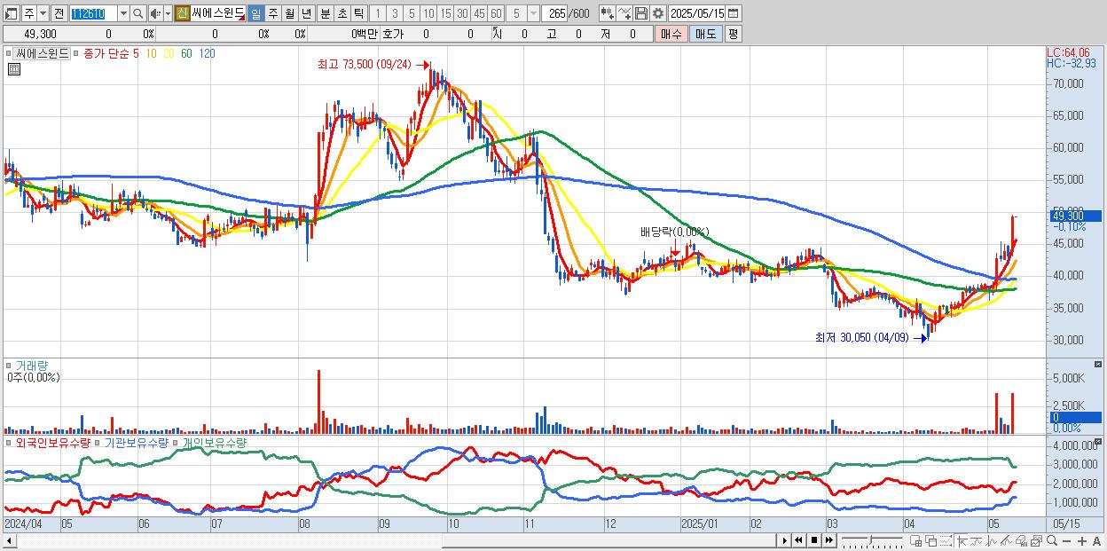 - 씨에스윈드 (49,300원 ▲ 14.78% , 시총: 20,791억, 거래량: 2,281,588, 거래대금:1,089억)
