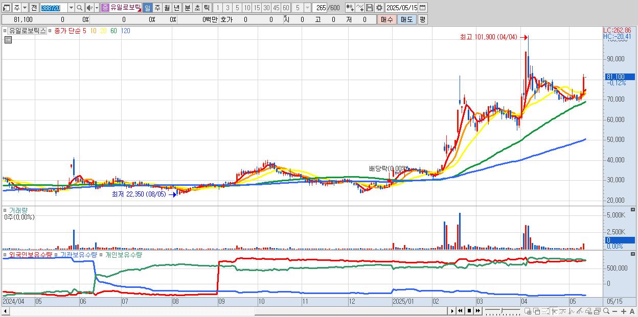 - 유일로보틱스 (81,100원 ▲ 11.55% , 시총: 9,313억, 거래량: 432,254, 거래대금:339억)