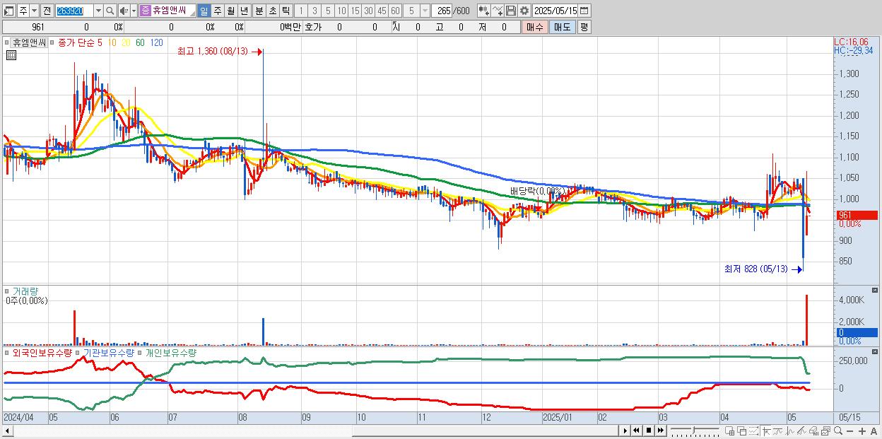- 휴엠앤씨 (961원 ▲ 11.74% , 시총: 471억, 거래량: 4,481,692, 거래대금:44억)