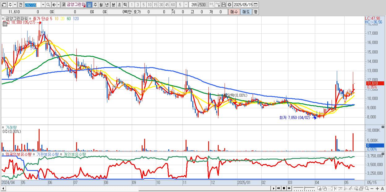 - 금양그린파워 (11,610원 ▲ 11.96% , 시총: 1,407억, 거래량: 5,498,929, 거래대금:657억)