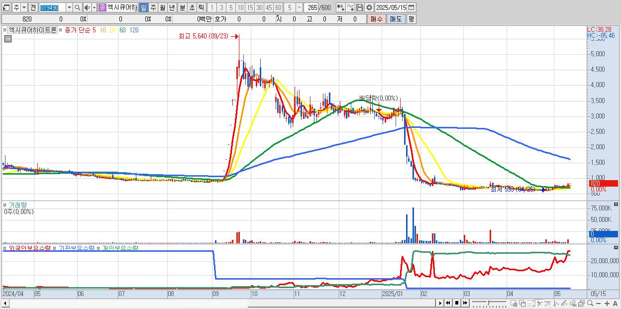 - 엑시큐어하이트론 (820원 ▲ 12.48% , 시총: 627억, 거래량: 7,129,456, 거래대금:57억)