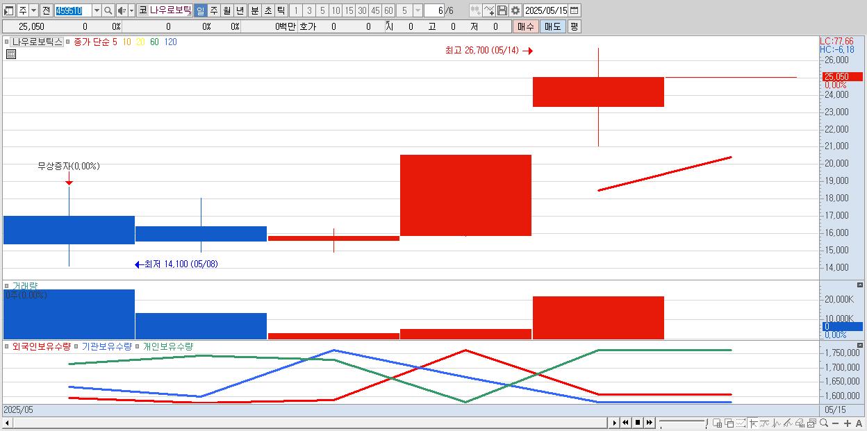 - 나우로보틱스 (25,050원 ▲ 21.9% , 시총: 3,143억, 거래량: 21,748,843, 거래대금:5,247억)