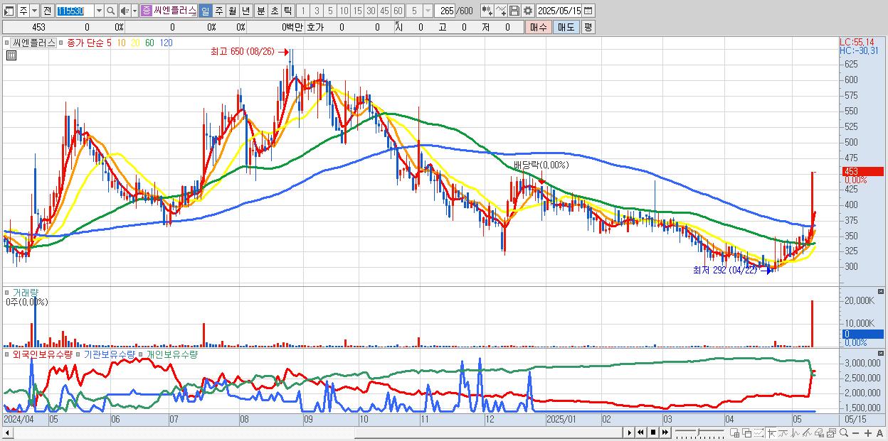 - 씨엔플러스 (453원 ▲ 29.8% , 시총: 308억, 거래량: 20,514,058, 거래대금:90억)