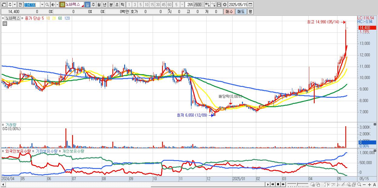 - 노바렉스 (14,400원 ▲ 21.01% , 시총: 2,701억, 거래량: 2,250,162, 거래대금:318억)