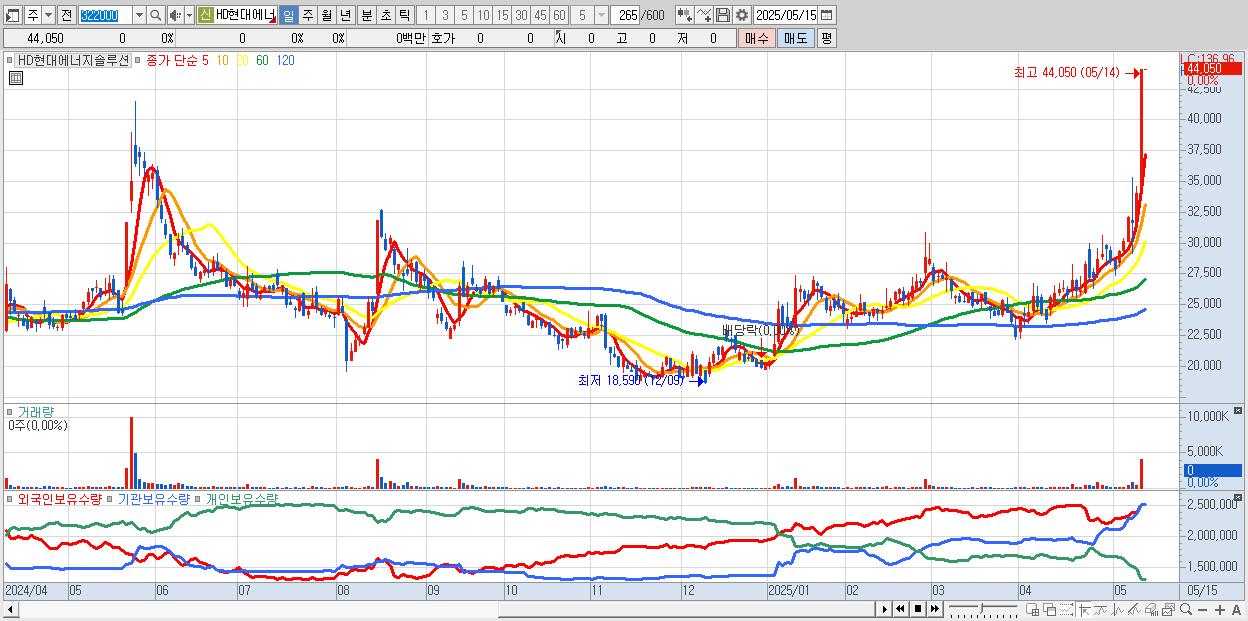- HD현대에너지솔루션 (44,050원 ▲ 29.94% , 시총: 4,934억, 거래량: 2,318,592, 거래대금:966억)