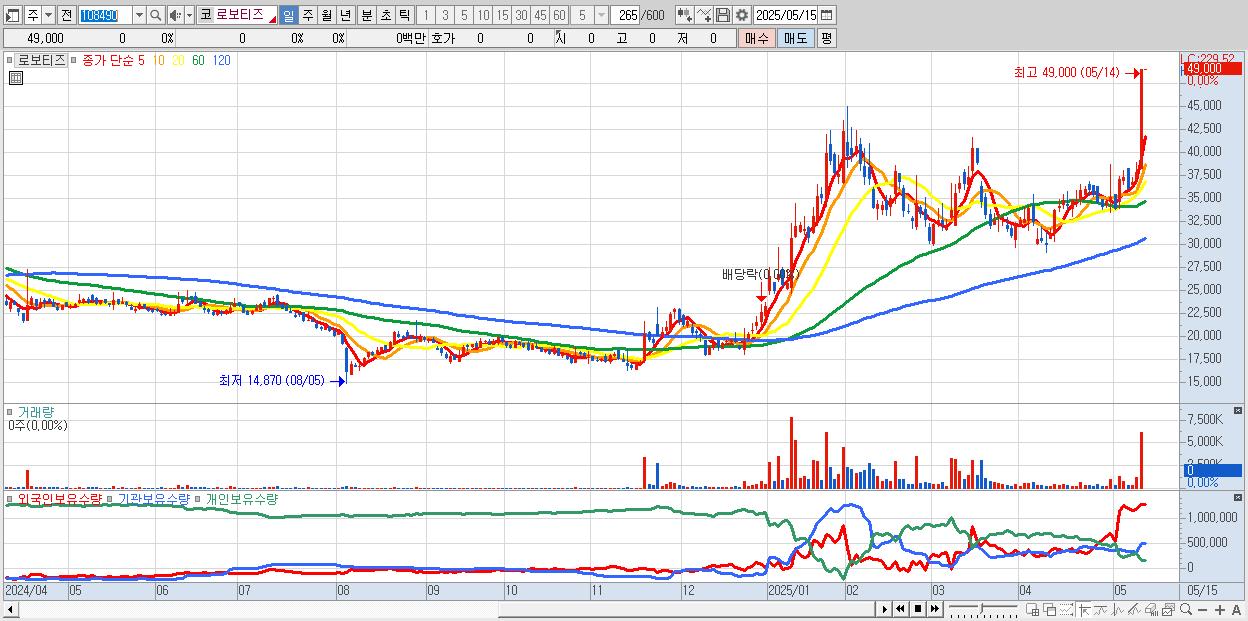 - 로보티즈 (49,000원 ▲ 29.97% , 시총: 6,474억, 거래량: 3,391,963, 거래대금:1,481억)