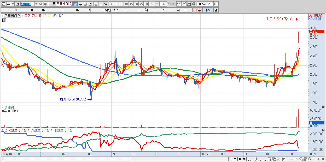 - 프롬바이오 (2,930원 ▲ 18.15% , 시총: 829억, 거래량: 55,756,053, 거래대금:1,627억)