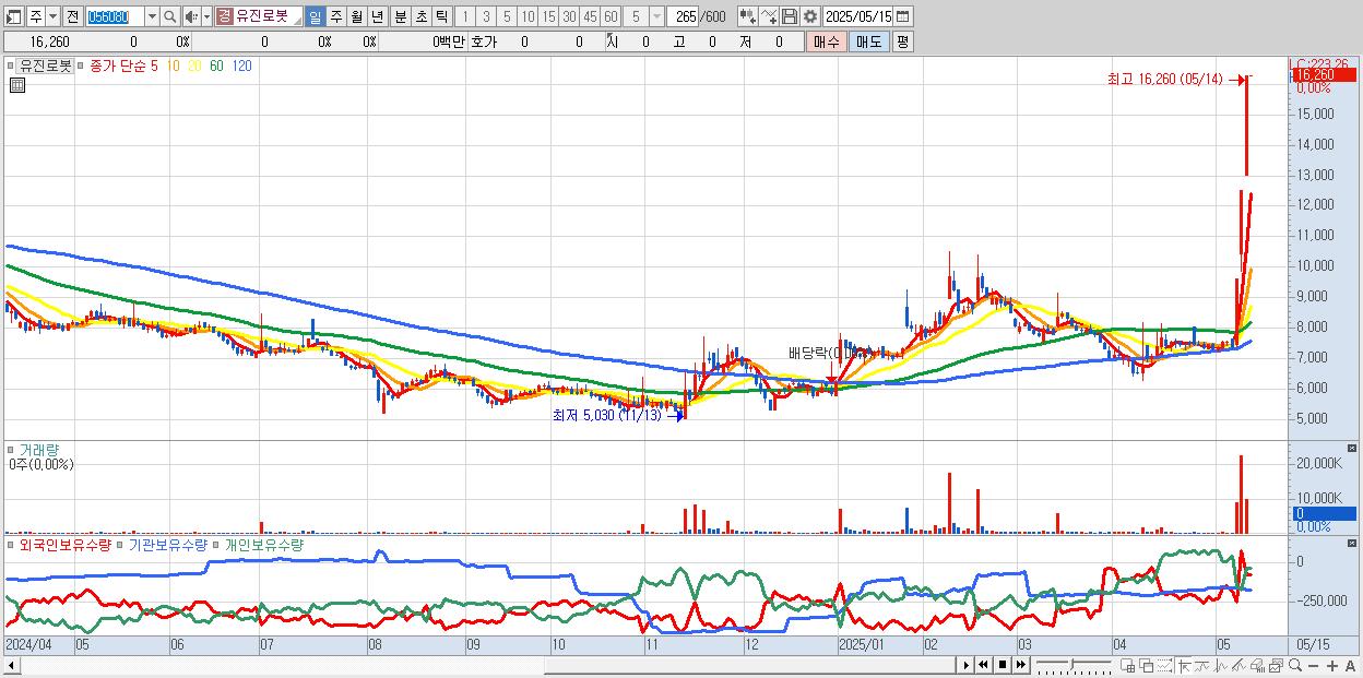 - 유진로봇 (16,260원 ▲ 29.98% , 시총: 6,099억, 거래량: 3,509,015, 거래대금:556억)