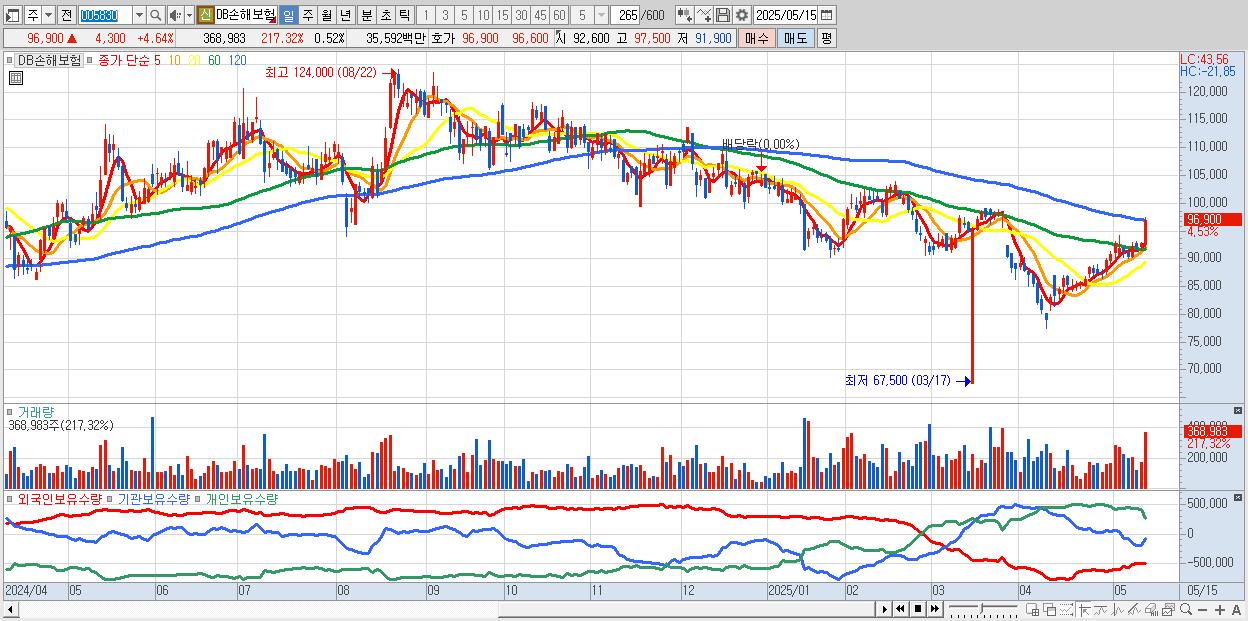 - DB손해보험 (97,300원 ▲ 5.08% , 시총: 68,888억, 외국인 순매수 거래금:91억)