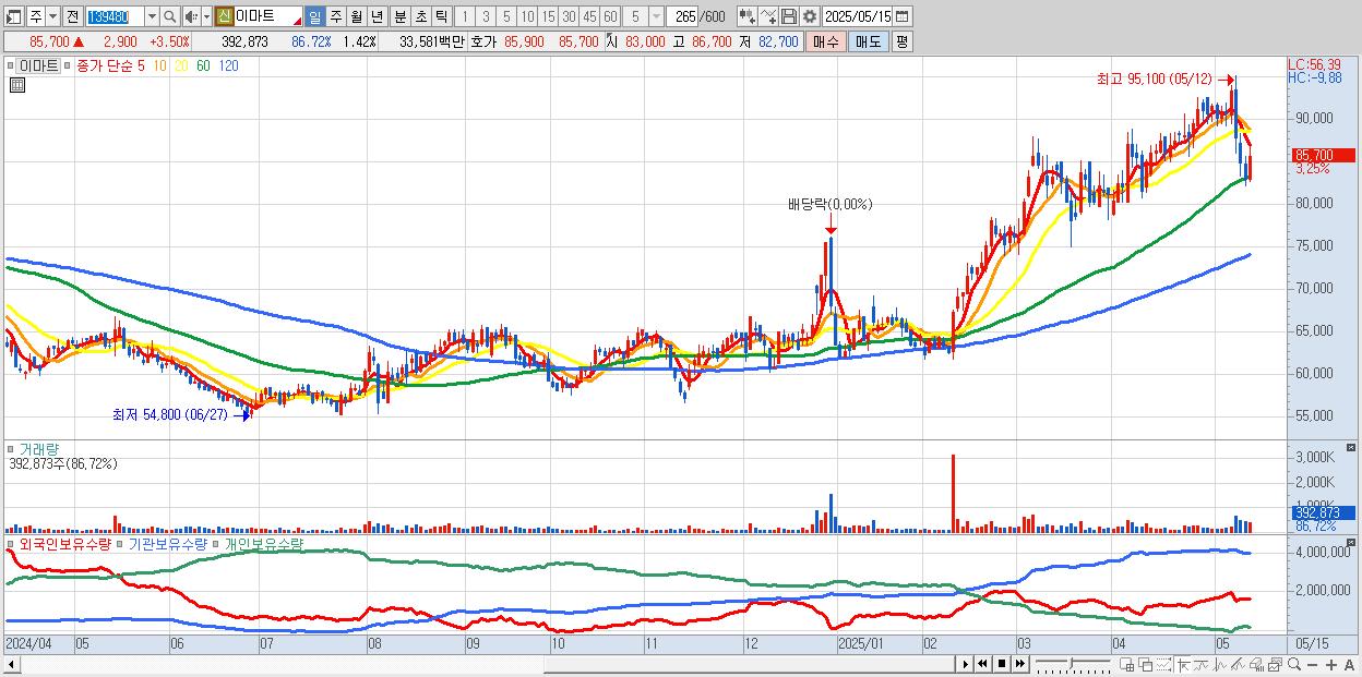 - 이마트 (86,300원 ▲ 4.23% , 시총: 23,815억, 외국인 순매수 거래금:66억)